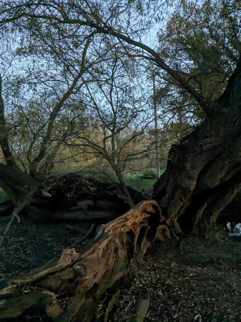 I am in a waterlogged field beside the river Deben. To escape the mud, I am standing on the collapsed trunk of an ancient willow. The tree has cleaved into three under its own weight, and the two splinter trunks now sprawl out horizontally over the mud. These rotting limbs sprout with as much vigour as the upright tree, so that I seem to be stood in a small copse of willow, all reaching out from the same core.